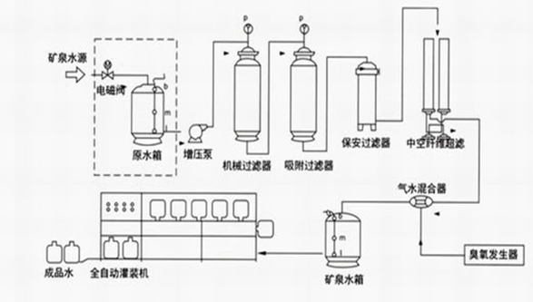 純凈水/礦泵水工藝流程 礦泉水廠生產工藝流程圖: 純凈水/礦泉水廠生產工藝流程(圖): a) 原水泵 主要功能:恒定系統供水壓力,穩定供水量 b) 機械過濾器 采用多次過濾層的過濾器,主要目的是去除原水中含有的錳、鐵重金屬、泥沙、鐵銹、膠體物質、懸浮物等顆粒在20um以上的物質,系統可以進行反沖洗、正沖洗等一系列操作。 主要功能:保證設備的產水量,延長設備的使用壽命。 c) 活性炭過濾器 采用果殼活性炭過濾器,活性炭不但可吸附電解質離子,還可以進行離子交換吸附。經活性炭吸附還可使高錳酸鉀耗氧量(COD)由15mg/L(02)降至2-7mg/L(02),此外由于吸附作用使表面被吸附復制的濃度增加,因而還起到催化作用,去除水中的色素、異味、大量生化有機物、降低水的余鹵值及農藥污染物和除去水中三鹵化物(THM)以及其他的污染物。系統可以進行反沖洗、正沖洗等一系列操作。同時,設備具有自我維護系統,運行費用很低。 主要功能:保證設備的產水質量,延長設備的使用壽命 d) 軟化系統 為防止濃水端特別是RO裝置最后一根膜組件濃水側出現CACO3,MGCO3,MGSO4,CASO4,BASO4,SRSO4,SISO4的濃度大于其平衡溶解度常數而結晶析出,損壞膜原件的應有特性,在進入反滲透膜組件之前系統采用鈉型陽離子交換樹脂,進行離子交換吸附,去除水中主要硬度成分,吸附飽和后,樹脂失效,可用工業用鹽進行再生樹脂,使之恢復交換能力。 每套軟化系統包括:軟化罐、控制器(或射流器/鹽泵)、鹽箱及鹽閥 主要功能:防止反滲透摸結垢,延長反滲透膜的使用壽命 e) 精密過濾器 精密過濾器用來截留預處理系統漏過的少量機械雜質。過濾器筒體采用工程塑料或SUS304材質;內裝PPF濾芯。聚丙烯濾芯是一種效率高、阻力小的深層過濾元件。適用于含懸浮雜質較低(濁度小于2-5度)的水進一步凈化。聚丙烯濾芯由聚丙烯纖維按一定規律纏繞在注塑聚丙烯多孔管上形成。主要功能:保證進入反滲透膜的水顆粒度小于0.1um f) 反滲透系統 反滲透裝置是用足夠的壓力使溶液中的溶劑(一般是水)通過反滲透膜(或稱半透膜)而分離出來,因為這個過程和自然滲透的方向相反,因此稱為反滲透。 反滲透法能適應各類含鹽量的原水,尤其是在高含鹽量的水處理工程中,能獲得很好的技術經濟效益。反滲透法的脫鹽率提高,回收率高,運行穩定,占地面積小,操作簡便,反滲透設備在除鹽的同時,也將大部分細菌、膠體及大分子量的有機物去除。 h)設備工藝流程圖: 原水→原水增壓泵→多介質過濾器→活性炭過濾器→離子交換器→保安過濾器→多級高壓泵→RO反滲透系統→純水箱→全自動桶/瓶水灌裝生產線→包裝→入庫 一、礦泉水生產工藝流程圖: 目前,我國給水中應用的氧化消毒劑以液氯為主。但隨著源水污染的變化,廢水中各種有機物的含量有所增加,運用液氯消毒會產生氯代有機物,其中有的產物具有致突變作用。為滿足人們對水質要求 的不斷提高,尋求能替代氯的更安全而經濟的新型氧化消毒劑,成為今后給水處理的一個發展方向。其中,較有前途的是二氧化氯(ClO2)和臭氧(O3)。 1.二氧化氯(ClO2) 1.1二氧化氯的應用 十九世紀初,美國科學家DaryH.發現了ClO2氣體。二十世紀40年代,二氧化氯開始應用于食品加工的殺菌消毒,造紙的漂白和水的凈化處理等。由于二氧化氯不會與有機物反應而生成THMs,所以在 飲用水處理中應用越來越廣泛。1983年,美國國家環保局(EPA)提出飲用水中三氯甲烷含量必需低于0.1mg/L,并推薦使用ClO2消毒。二氧化氯消毒的安全性被世界衛生組織(WHO)列為A1級,被認定為 氯系消毒劑最理想的更新換代產品。目前,美國和歐洲已有上千家水廠采用ClO2消毒;我國則多用于造紙、紡織等行業,并逐步應用于自來水廠。 在給水處理中,ClO2不僅可以作為高效的消毒劑,還可考慮投加在原水、沉淀池前或濾池前,進行預氧化或中間氧化,以控制嗅味(尤其是氯酚或藻類副產物嗅味等),防止微生物滋長,加強混凝 過濾;也可用于去除水中的鐵、錳和色度。另外,歐洲一些國家將ClO2、O3即Cl2結合起來用于飲用水處理,取得了較好的效果。 1.2二氧化氯的物理性質 二氧化氯(ClO2)常溫(20℃)下是一種黃綠色的氣體,具有與氯氣、臭氧類似的刺激性氣味,分子量67.45,比空氣重,熔點-59℃,沸點11℃。 ClO2極易溶于水而不與水反應,22℃時溶解度約為氯的5倍,達2.9g/L。ClO2在水中的溶解度隨溫度升高而降低。同時二氧化氯分子的電子結構雖是不飽和狀態,在水中卻不以聚合狀態存在,這對 ClO2在水中迅速擴散十分有利。但ClO2水溶液易揮發,在較高溫度與光照下會生成ClO2-與ClO3-,應避光低溫保存。 據介紹,ClO2在常溫下可壓縮成深紅色液體,極易揮發,極不穩定,光照、機械碰撞或接觸有機物都會發生爆炸;在空氣中的體積濃度超過10%或在水中濃度超過30%時也會發生爆炸。不過ClO2溶液 濃度在10g/L以下時基本沒有爆炸的危險。 由于ClO2對壓力、溫度和光線敏感,不能壓縮進行液化儲存和運輸,只能在使用時現場臨時制備。 1.3二氧化氯的氧化消毒機理 作為強氧化劑,ClO2在酸性條件下具有很強的氧化性:ClO2+4H++5e=Cl-+2H2O 在水廠pH≈7的中性條件下, ClO2+e=ClO2- ClO2-+2H2O+4e=Cl?-+4OH- ClO2能將水中少量的S2-、SO32-、NO2-等還原性酸根氧化去除,還可去除水中的Fe2+、Mn2+及重金屬離子等。另外,對水中有機物的氧化,Cl2以親電取代為主,而ClO2以氧化還原為主 ,能將腐殖酸、